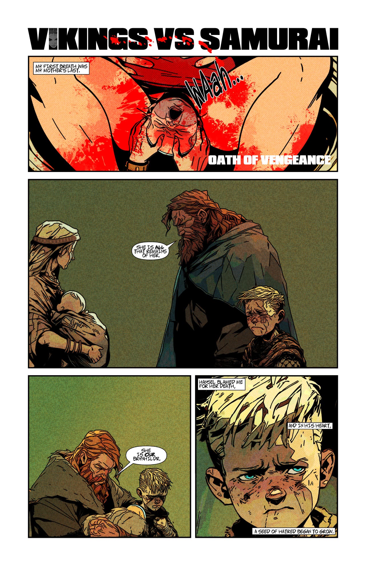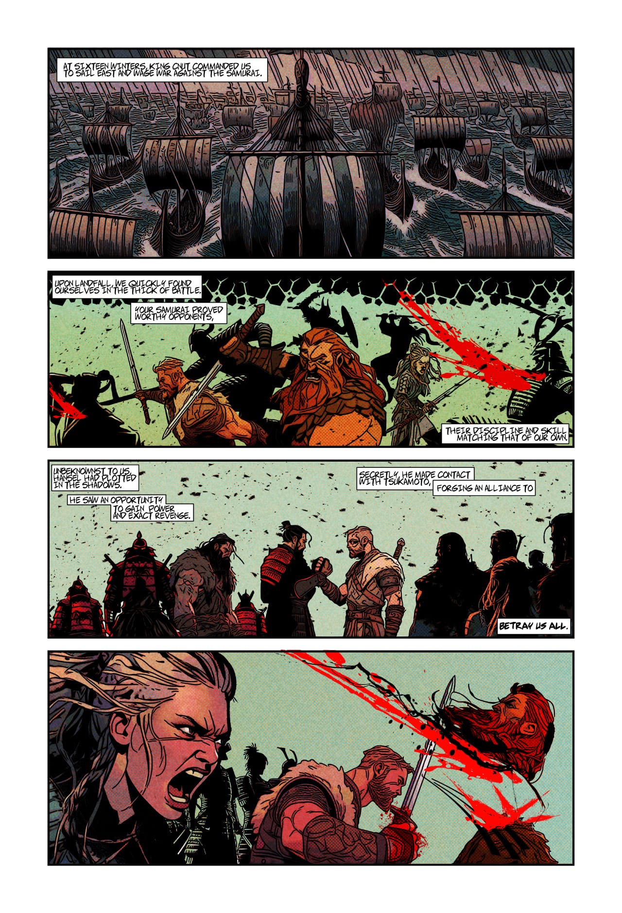 In a peaceful village, Hiroshi hides his sister as bandits attack. Samurai demand tribute, but Vikings soon arrive, only to enslave the villagers in brutal rule.